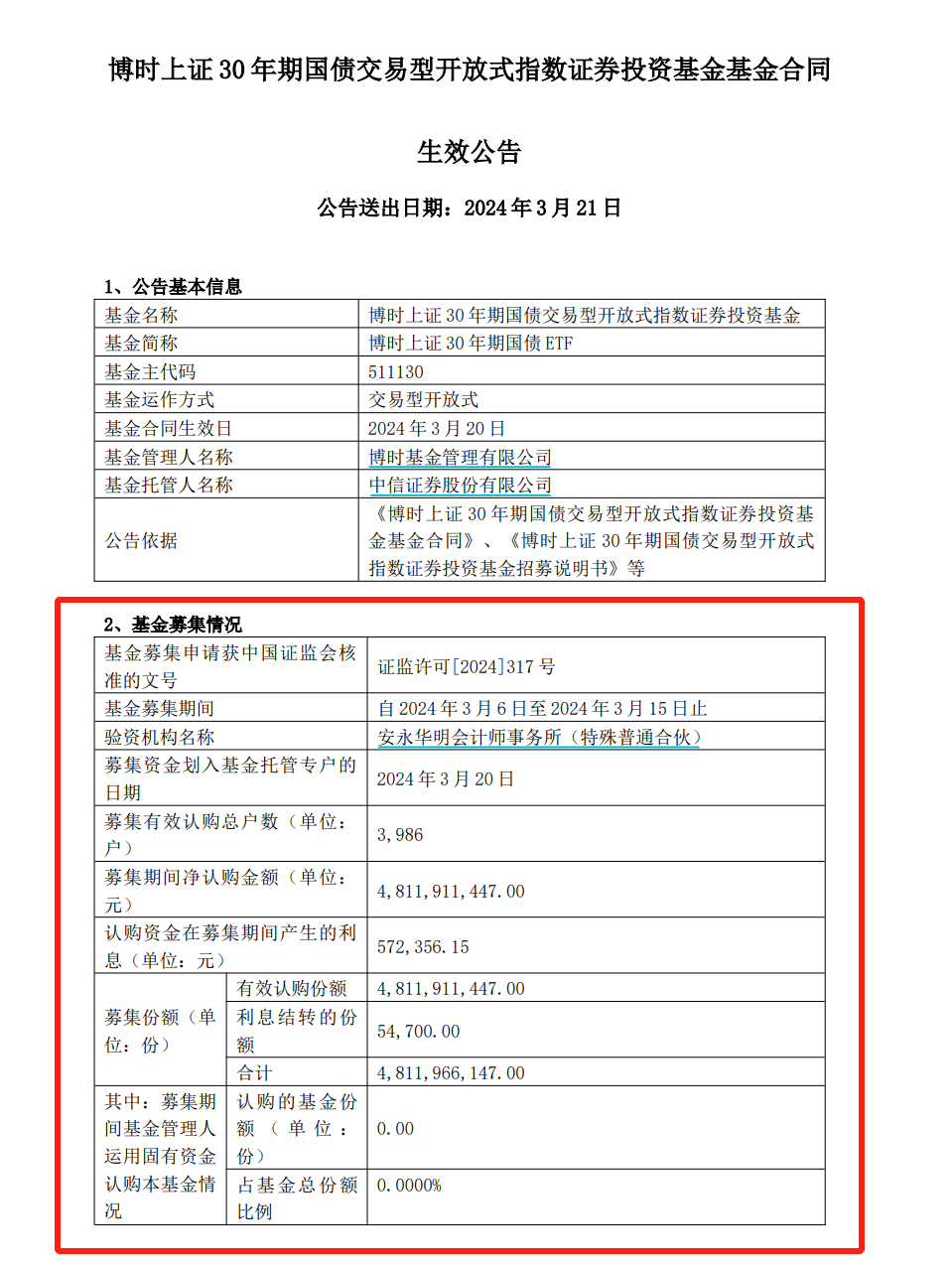 公告显示,经过为期8天的募集,博时上证30年期国债ETF期间净认购金额达到48.12亿元,募集有效认购户数达到3986户,不仅是今年募集规模最大的债券型ETF,也是目前市场上第二只超长期限国债ETF。