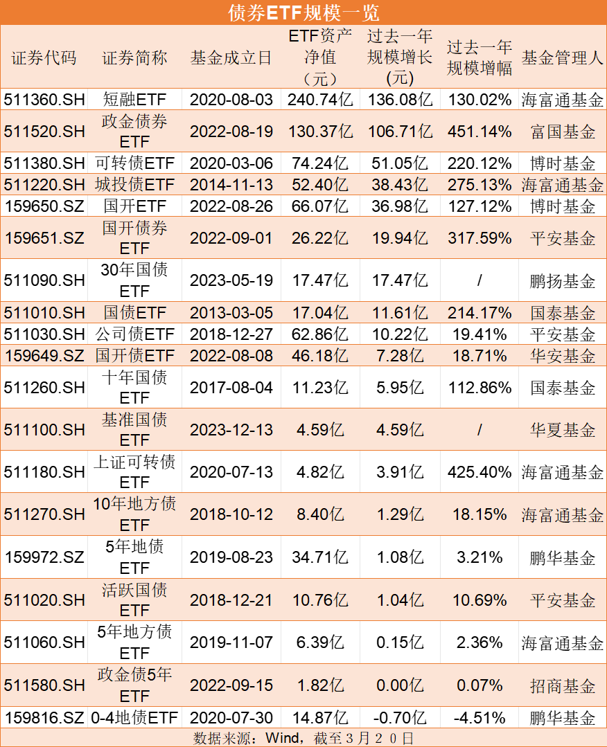 Wind数据显示,截至3月20日,全市场债券ETF共19只,相比一年前增长了两只;存量规模达831.20亿元,相比一年前规模增长453.08亿元,规模增幅高达119.83%,获资金持续净流入。