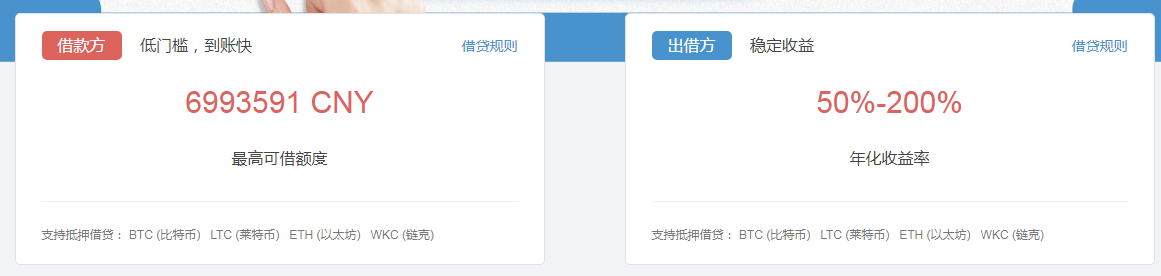 记者注意到,高级版还提供“数字货币抵押贷款”服务,记者打开的页面显示,最高可借额度约为70万元人民币,年化收益为50%至200%,已有投资者挂单进行借贷,累计借贷金额从几千至几万元都有。页面显示支持抵押的数字货币包括BTC (比特币)、LTC (莱特币)、ETH (以太坊)、WKC (链克)。