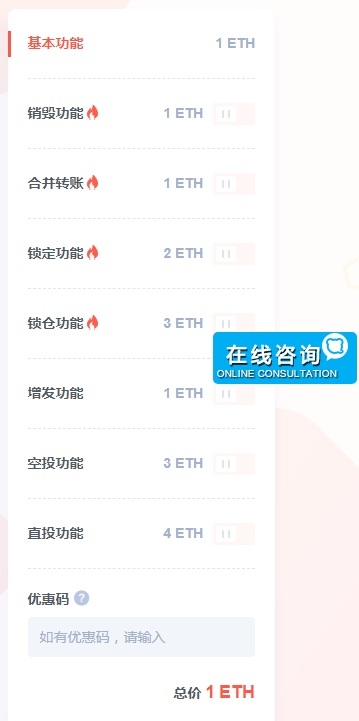 客服人员向记者介绍道,全部功能都有的代币是16个ETH,增发、销毁、锁定三个功能则是5个ETH。非小号数据显示,目前ETH的价格是2108元左右,意味着创建一种代币,三种功能最低需要约一万元,而最高三万元多一点。