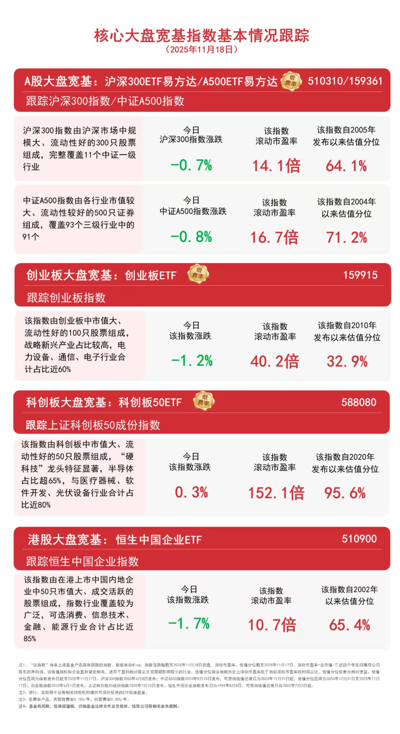 截至收盘,中证A500指数下跌0.8%,沪深300指数下跌0.7%,创业板指数下跌1.2%,上证科创板50成份指数上涨0.3%,恒生中国企业指数下跌1.7%。