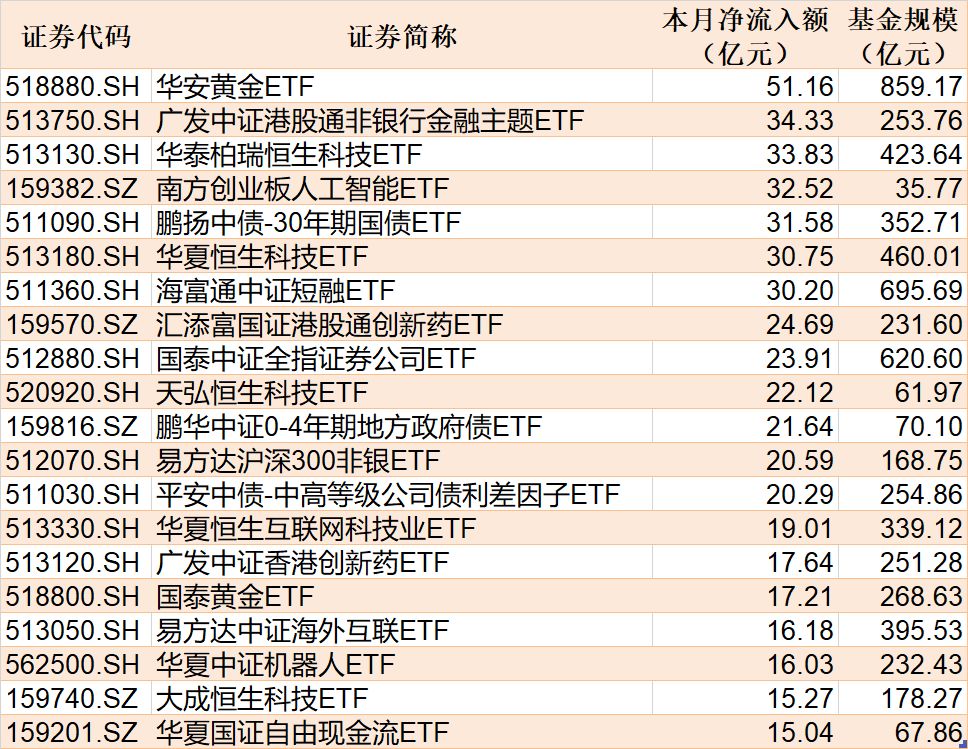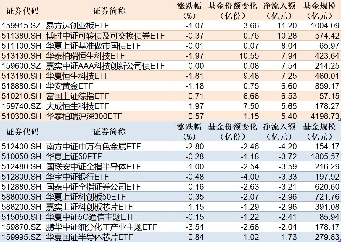 ETF规模速报 黄金ETF净流入超16亿元,创业板ETF净流出超15亿元