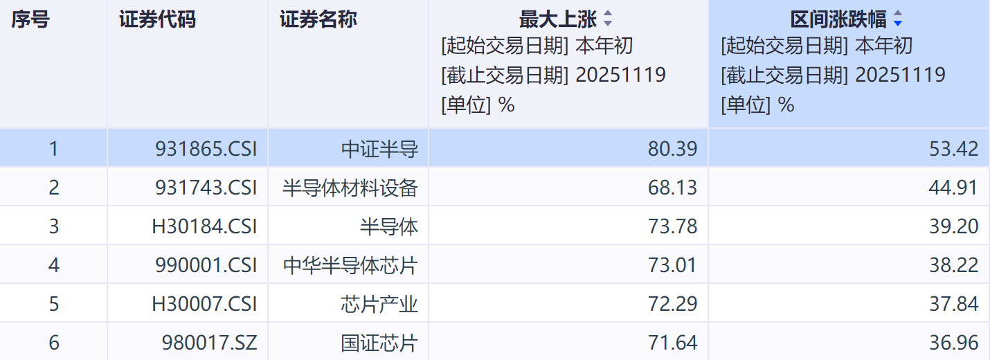 相关指数方面,截至11月19日,中证半导年内涨幅达53.42%、区间最大上涨超80%,在半导体材料设备、中华半导体芯片、芯片产业、国证芯片等主流半导体指数中位居第一,弹性表现突出。