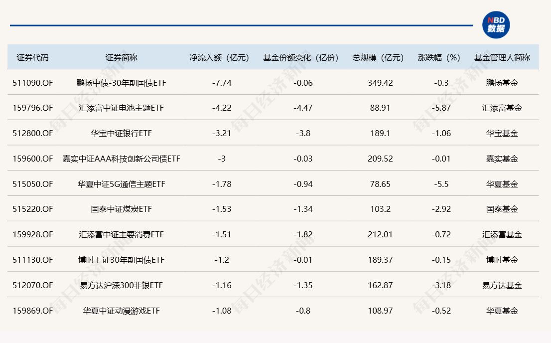 与此同时,鹏扬中债-30年期国债ETF基金份额减少0.06亿份,对应资金净流出7.74亿元;汇添富中证电池主题ETF份额减少4.47亿份,出现净流出4.22亿元;华宝中证银行ETF份额减少3.80亿份,录得净流出3.21亿元。