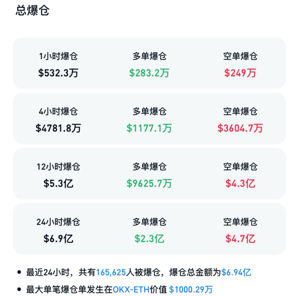 Coinglass数据显示,过去24小时加密货币市场共有超16万人被爆仓,爆仓总金额为6.94亿美元,其中多单爆仓2.3亿美元,空单爆仓4.7亿美元。